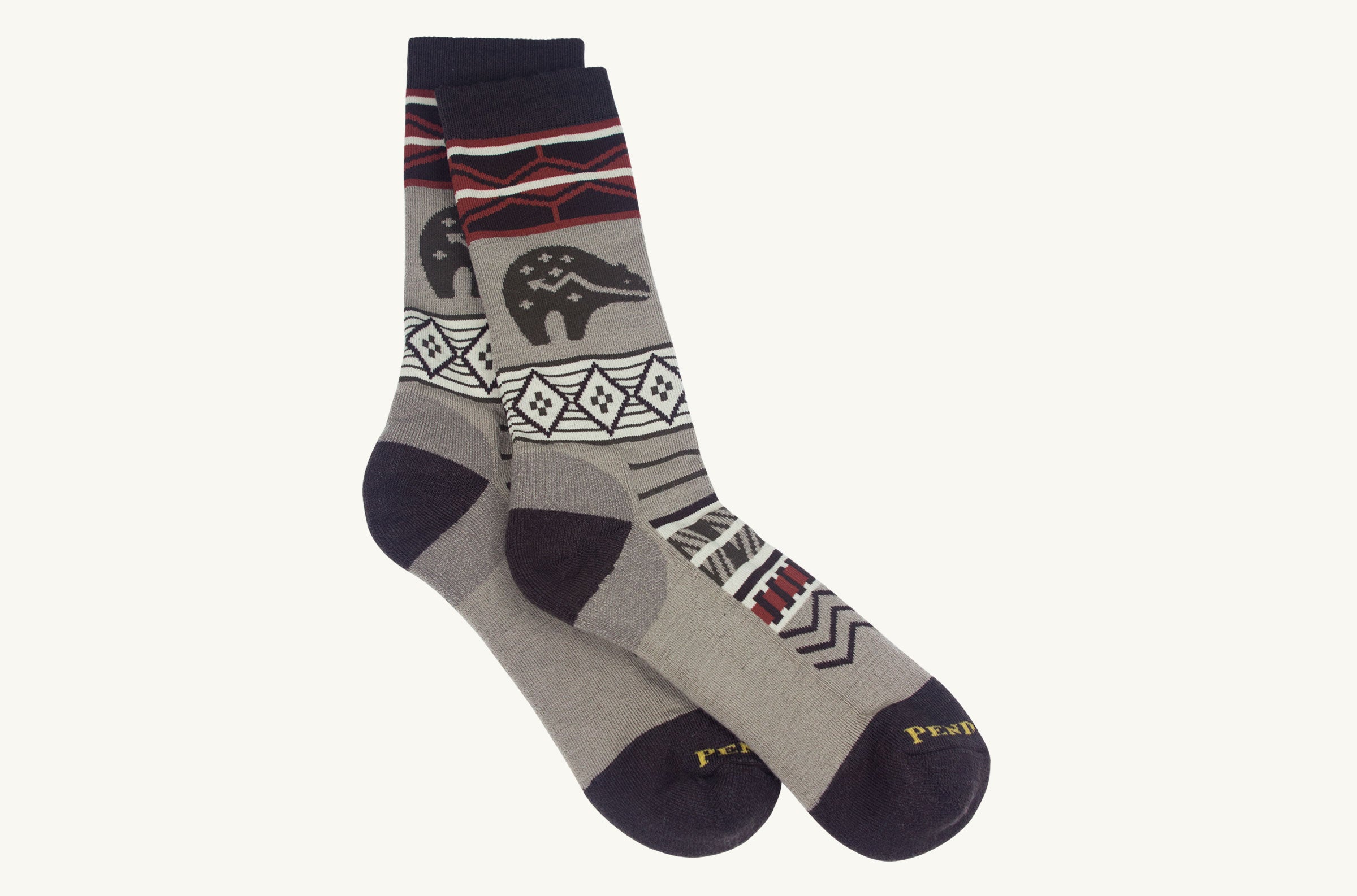 Unisex crew socks featuring an exclusive Pendleton pattern. in a smooth flat knit for ultralight comfort and year-round wear. Reinforced heels and toes provide durability.